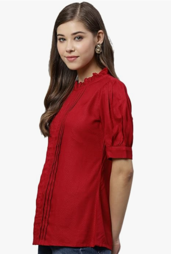 Yash Gallery Women’s Rayon Dobby Solid Top features a high neck and half puff sleeves for a stylish and elegant look. Designed in a straight regular fit, it is perfect for casual and semi-formal wear