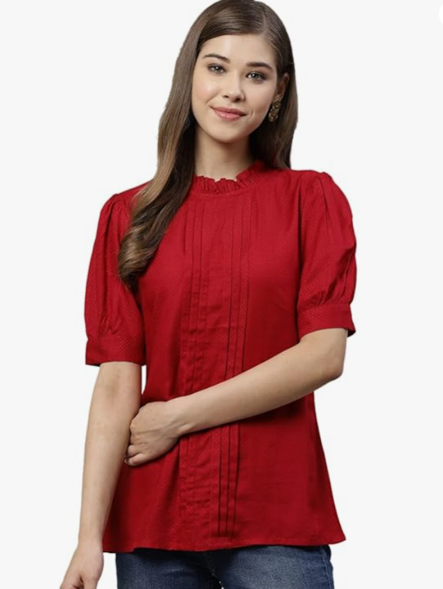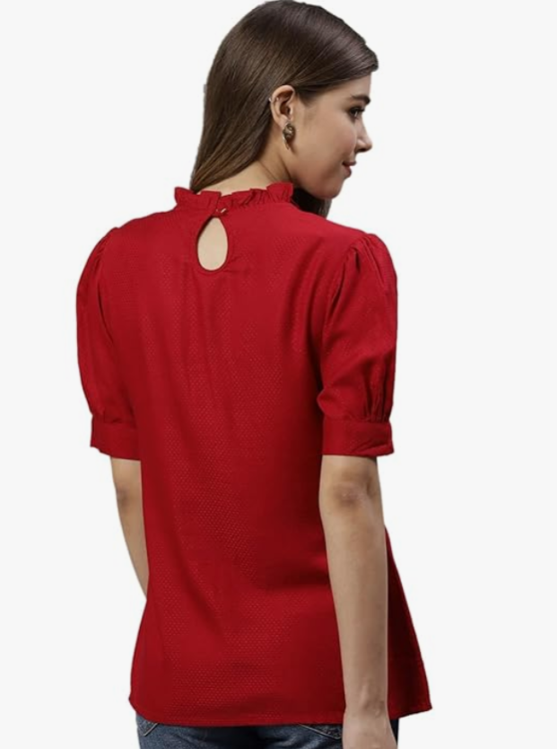 Yash Gallery Women’s Rayon Dobby Solid Top features a high neck and half puff sleeves for a stylish and elegant look. Designed in a straight regular fit, it is perfect for casual and semi-formal wear